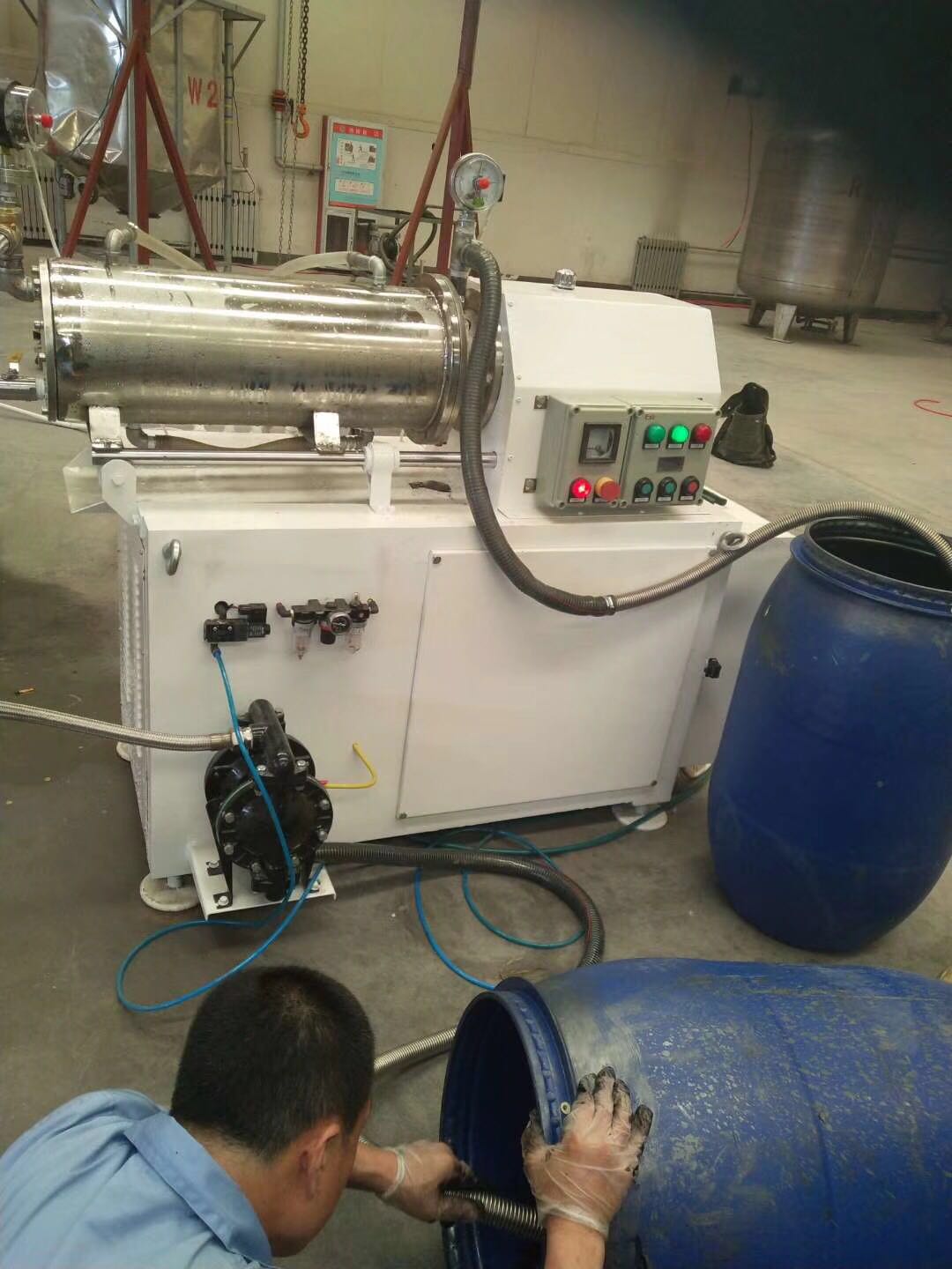 臥式砂磨機是一種廣泛用于涂料、染料、油漆、油墨、醫藥、磁臥式砂磨機粉、鐵氧體、感光膠片、農藥、造紙以及化妝品等非金屬礦行業(yè)的濕法超微研磨分散機械。臥式砂磨機按結構不同可分為普通臥式砂磨機,輪銷(xiāo)臥式砂磨機,齒盤(pán)臥式砂磨機及渦輪式臥式砂磨機。 臥式砂磨機工作連續性強,少污染,自控可靠,且成本低,結構緊湊 1、 普通臥式砂磨機按工作筒體的有效容積分為:WS-10、WS-20、WS-30、WS-50、WS-60、WS-80、WS-100七種機型。 2、 按與物料接觸的材質(zhì)分為碳鋼和不銹鋼。 3、 按具體使用條件和要求,分防爆和普通電機共二十種機型。 是利用料泵將經(jīng)過(guò)攪拌機預分散潤濕處理后的固-液相混合物料輸入筒體內,物料和筒體內的研磨介質(zhì)一起被高速旋轉的分散器攪動(dòng),從而使物料中的固體 微粒和研磨介質(zhì)相互間產(chǎn)生更加強烈的碰撞、摩擦、剪切作用,達到加快磨細微粒和分散聚集體的目的。研磨分散后的物料經(jīng)過(guò)動(dòng)態(tài)分離器分離研磨介質(zhì),從出料管流出。臥式砂磨機特別適合分散研磨粘度高而粒度要求細的產(chǎn)品。 |